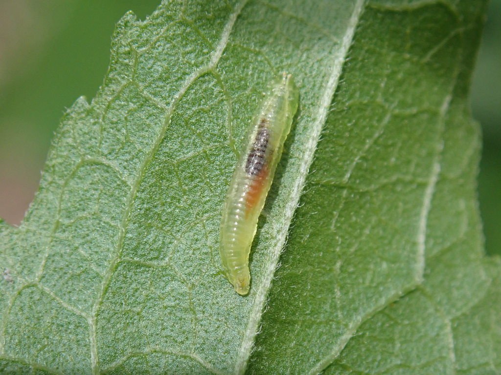 Lacewing larvae, sometimes called aphid lions, are voracious predators. Although they are known for consuming aphids, they target a variety of other pests, including mites, thrips, mealybugs, and various insect eggs. Larvae are gray or brown with an “alligator” shape similar to lady beetle larvae. They have large pincers that they use to grab onto prey and drink their body fluids.