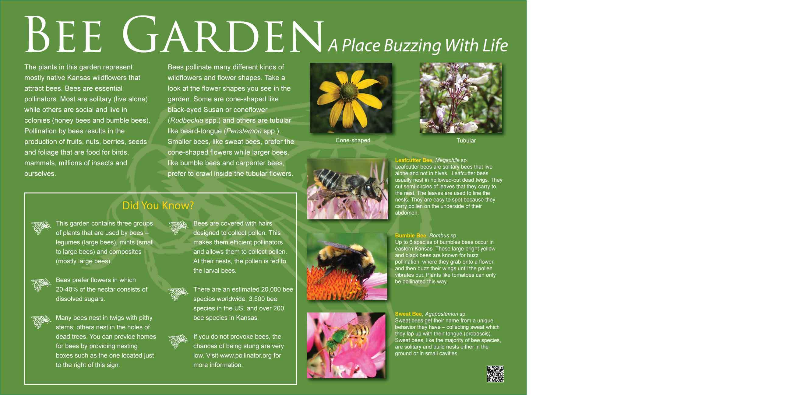 The plants in this garden represent mostly native Kansas wildflowers that attract bees. Bees are essential pollinators. Most are solitary (live alone) while others are social and live in colonies (honey bees and bumble bees). Pollination by bees results in the production of fruits, nuts, berries, seeds and foliage that are food for birds, mammals, millions of insects and ourselves. Bees pollinate many different kinds of wildflowers and flower shapes. Take a look at the flower shapes you see in the garden. Some are cone-shaped like black-eyed Susan or coneflower (Rudbeckia spp.) and others are tubular like beard-tongue (Penstemon spp.). Smaller bees, like sweat bees, prefer the cone-shaped flowers while larger bees, like bumble bees and carpenter bees, prefer to crawl inside the tubular flowers.