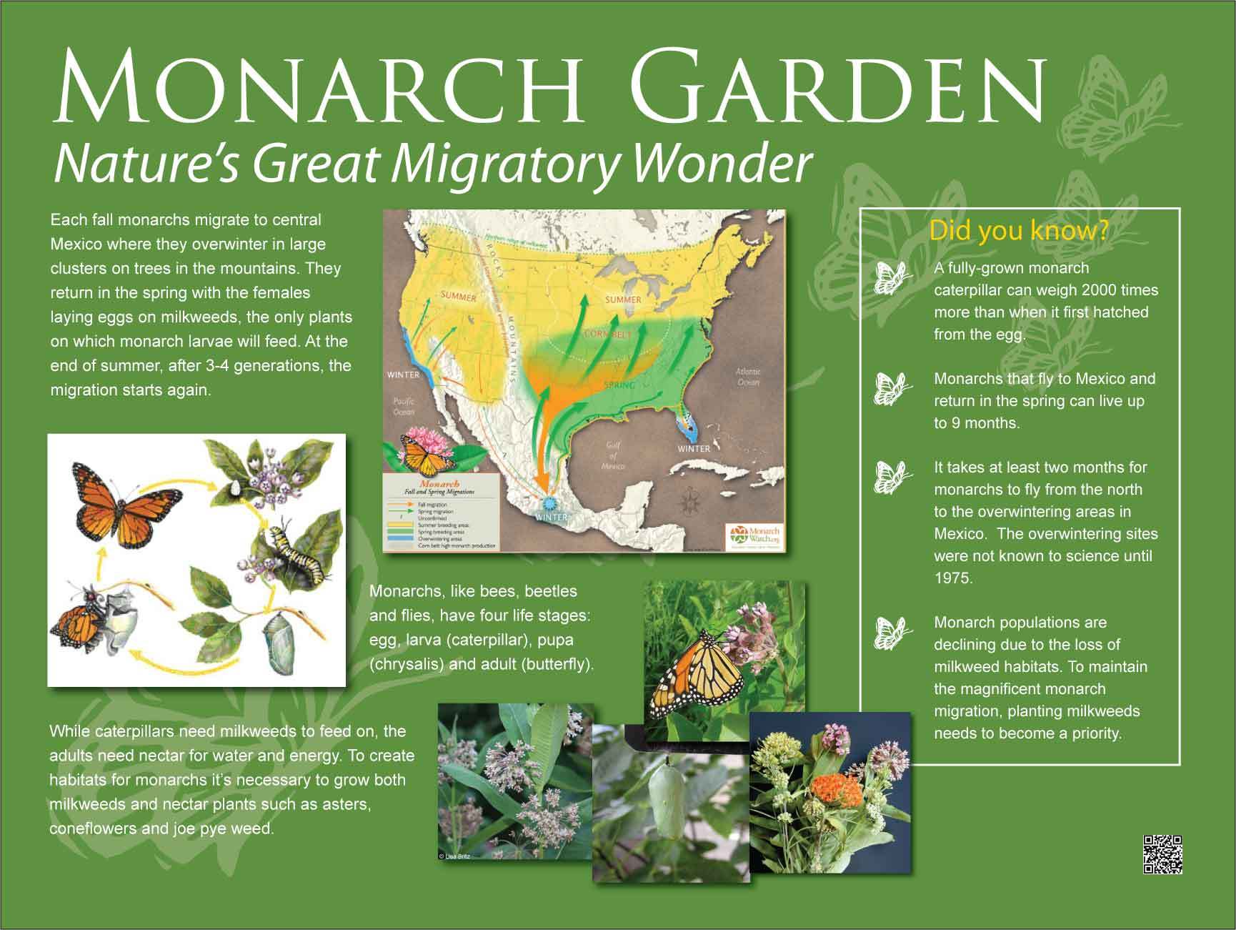 Each fall monarchs migrate to central Mexico where they overwinter in large clusters on trees in the mountains. They return in the spring with the females laying eggs on milkweeds, the only plants on which monarch larvae will feed. At the end of summer, after 3-4 generations, the migration starts again.