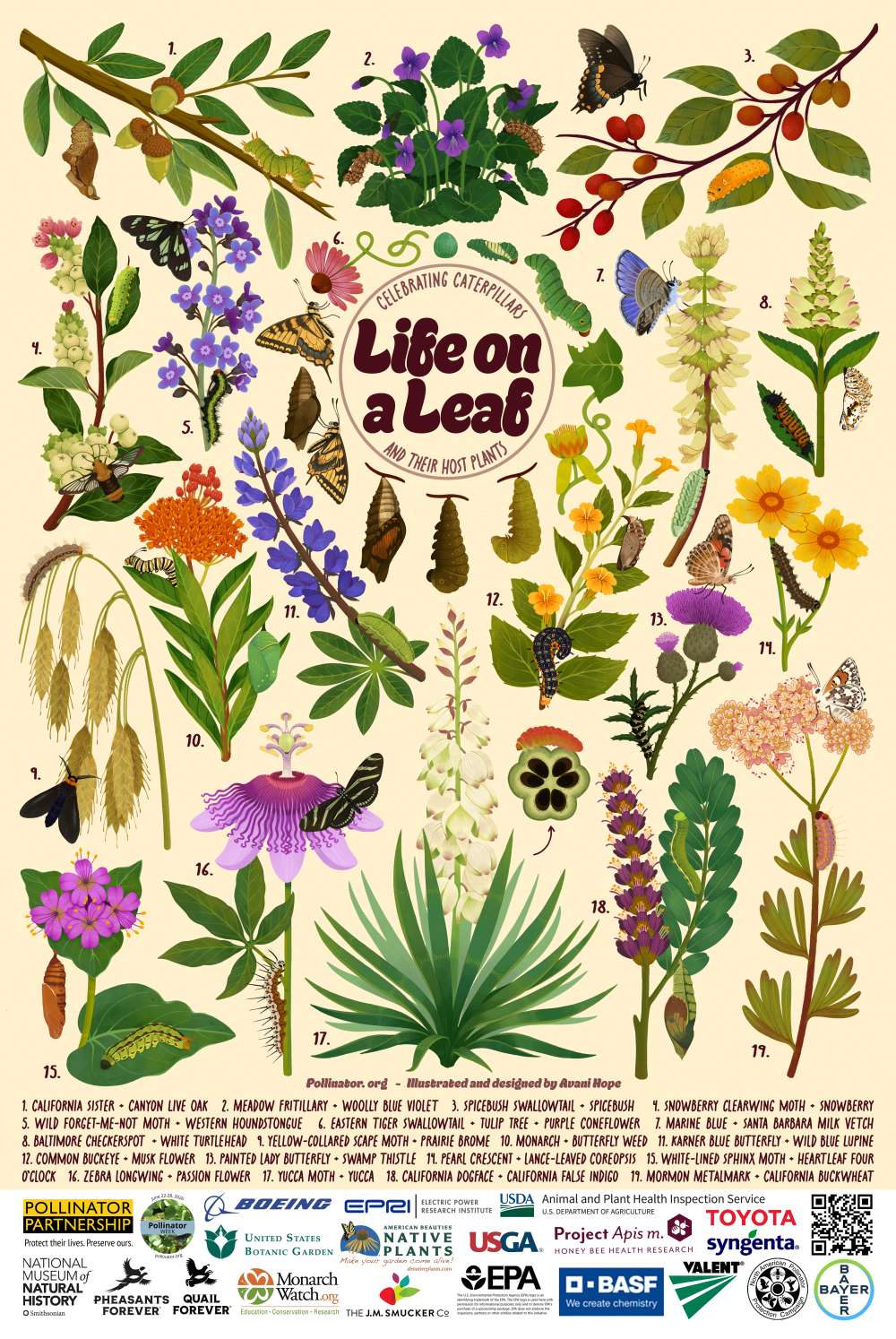 It's here! The 2026 Pollinator Poster, “Life on a Leaf: Celebrating Caterpillars and Host Plants" showcases the vital host plants that support Lepidoptera (butterfly and moth) larvae. Healthy habitat and host plant availability are critical to the life cycle of many of our vulnerable pollinator populations. Our goal is to showcase the impact that individuals can have on the life cycles of many of our pollinators just by planting native host plants in their native habitat. Hundreds of species of Lepidoptera in North America rely on one or two specific plants for reproduction. Whether a home garden, roadside habitat, a municipality, farmland, or a corporate garden, we can all make a difference by creating important habitat or food sources through host plants for our pollinators. Find past year's posters at pollinator.org/shop/posters.